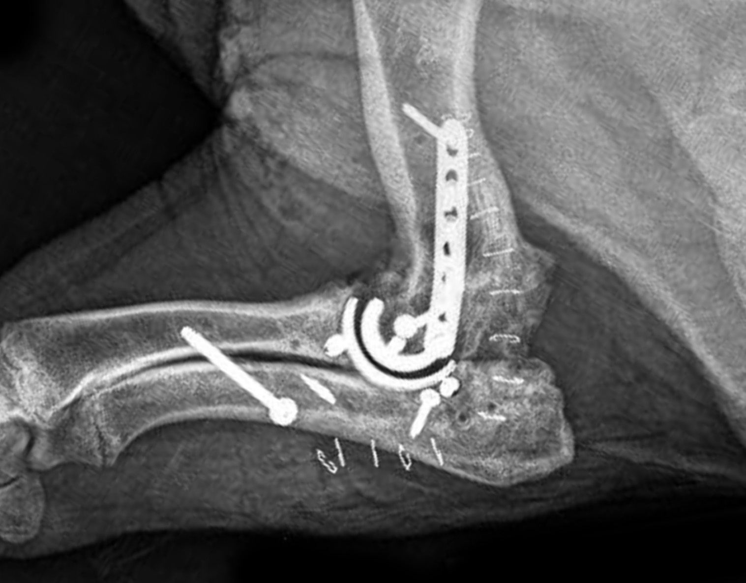 “Willow was examined at Cornell after being rescued and taken into the care of Where Pigs Fly Rescue & Sanctuary. She had chronic, multi limb lameness that required an intensive pain control regime to facilitate basic day-to-day movement, such as standing for meals. Although hind-limb surgery to treat a luxating patella improved her gait, Willow had difficulty rising and ambulating due to crippling left elbow arthritis. A Total Elbow Replacement (TER) was elected to treat discomfort and preserve joint function to the greatest extent possible. Since her surgery, Willow has physiotherapy exercise and an intensive medication program. She has gradually been weaned from her pain medication and is now able to enjoy outside time, savor her favorite snacks, and move around the pasture at her new home, Arthur’s Acres Animal Sanctuary!”